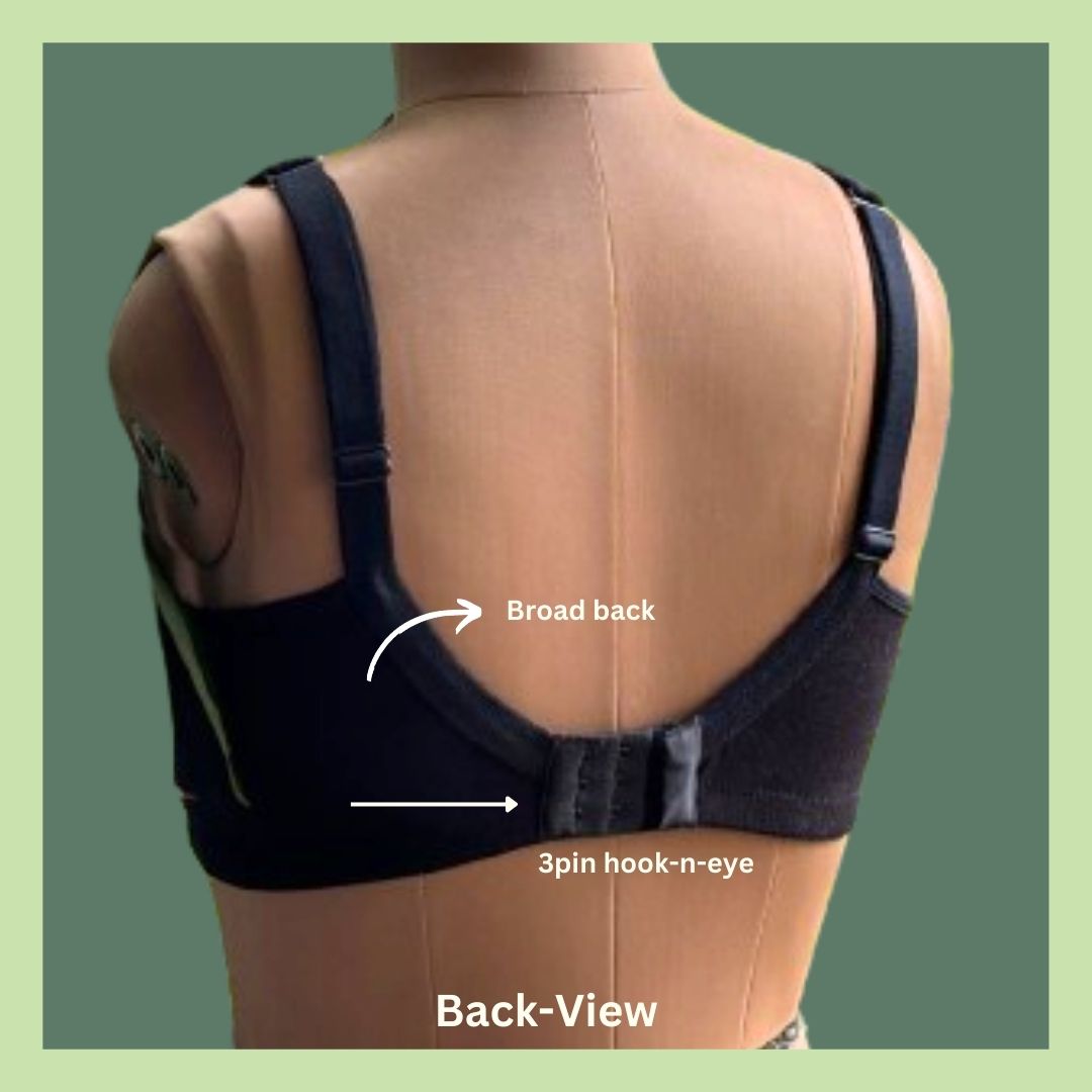 Product features include a back opening, an inner pocket for breast prosthetics, a non-wired and non-padded design, full coverage, a cushioned broad strap, and a 3-pin hook.